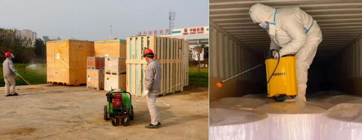 中國(guó)樂(lè)凱集團(tuán)公共事業(yè)部嚴(yán)格落實(shí)防疫要求,進(jìn)口到貨采取“多重消毒”,即進(jìn)口集裝箱進(jìn)入卸料區(qū)后,由消毒人員對(duì)車(chē)輛和集裝箱進(jìn)行整體的外部消毒;打開(kāi)集裝箱箱門(mén)后,消毒人員進(jìn)入集裝箱,對(duì)箱內(nèi)貨物進(jìn)行二次消毒